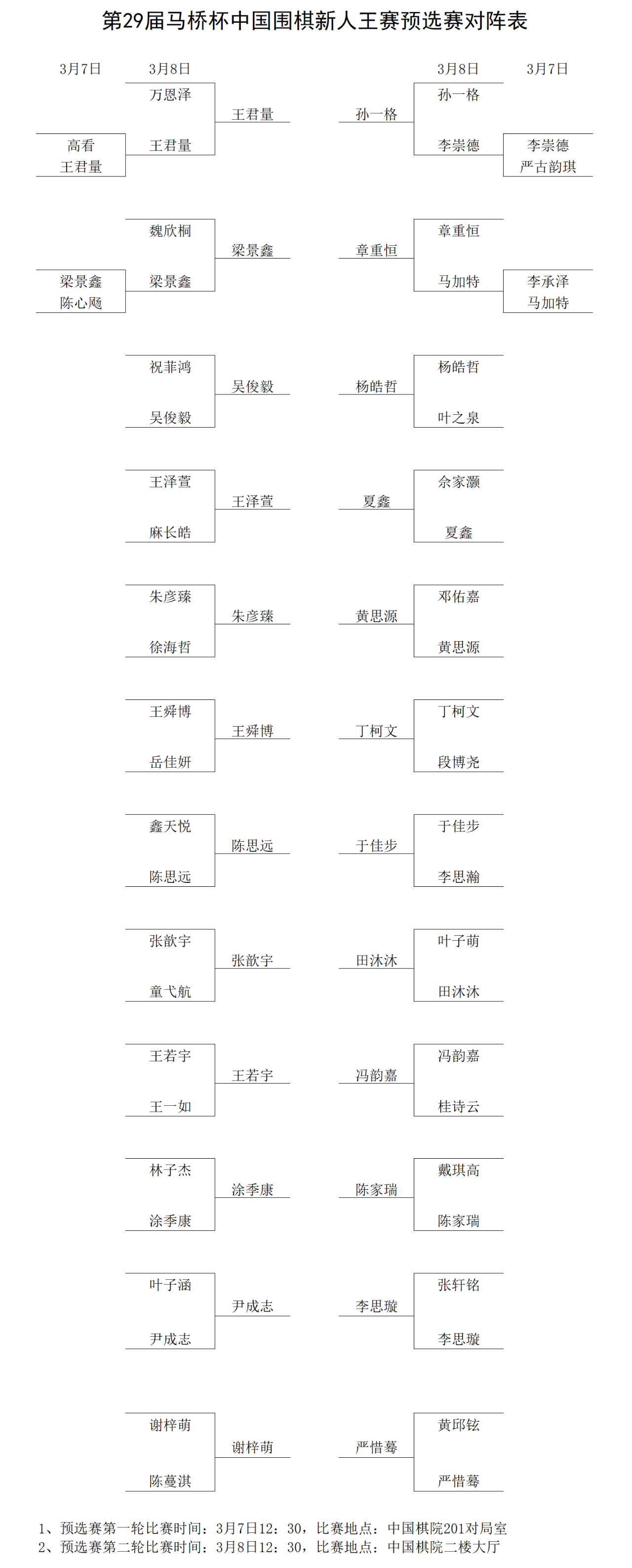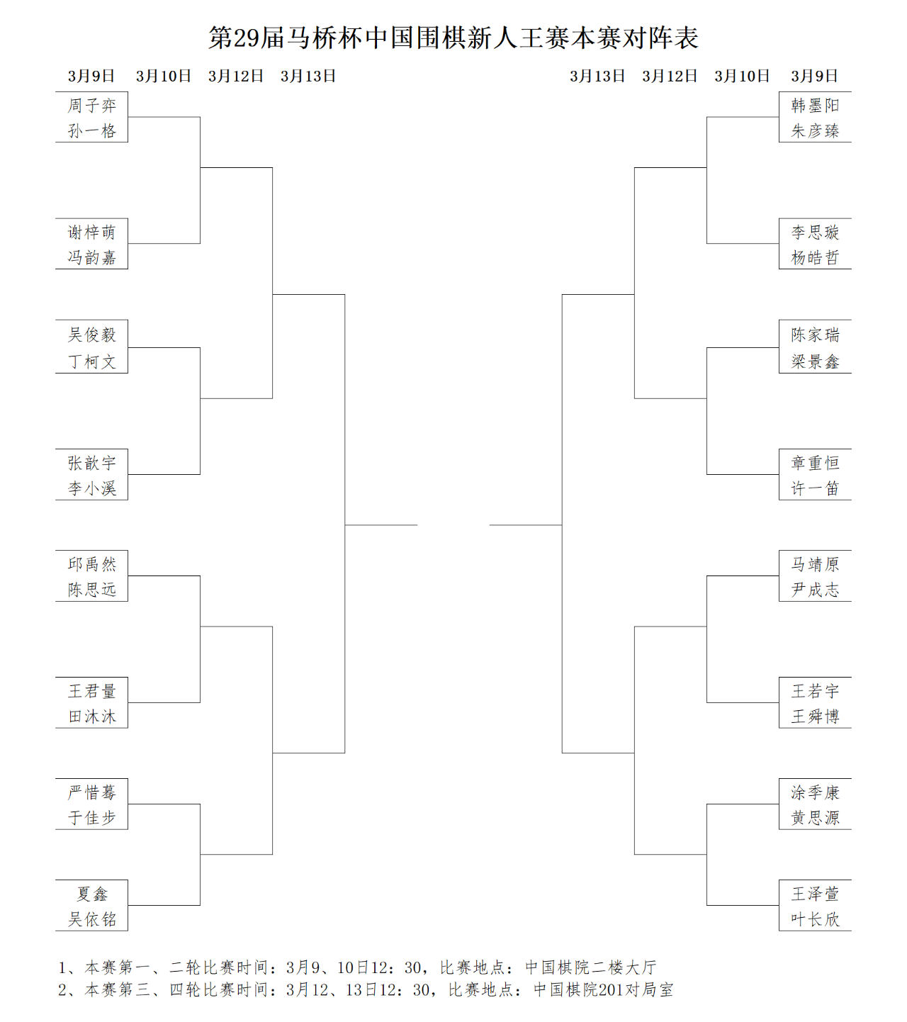 第29届马桥杯中国围棋新人王赛预选赛结果、本赛对阵